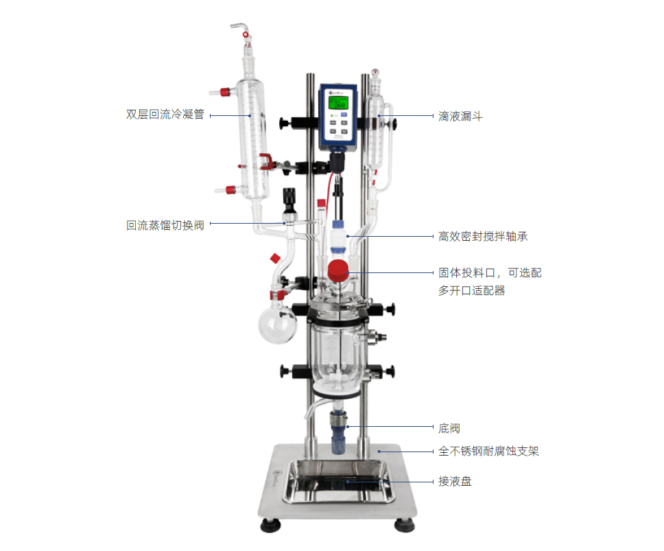 > 底阀规格:0-10mm,特 殊需求可选择 0~20mm> 五开口反应釜盖:中 心开口 :24/40,侧开口 :24/40(3 个 ),45° GL45 螺纹开口 (1 个 )> 反应釜釜体材质:高品质硼硅玻璃材质> 温度范围:-60~200℃(需配套加热制冷循环器)> 压力范围:适用于常减压反应实验> 夹套压力范围:可耐受 0.5bar 压力> 接液部分材质:硼硅玻璃材质 / PTFE / PFA> 夹套进出口规格:DN15