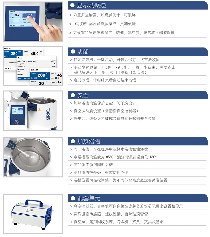 快速、Safe、稳定和易用。 提供可靠的分离,浓缩和纯化解决方案。 Strike 185 配备计时器,程序控制,自动提升等功能。 更多的保护措施,包括:过热设置和保护,断电时自动升起,实时监测蒸汽和冷却水温度等。